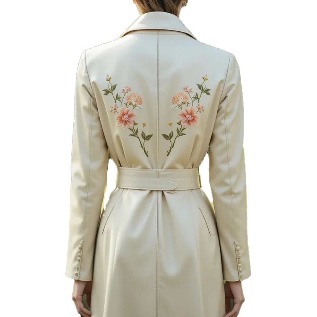 JW Leather Handcrafted long coat is made of genuinely soft sheep leather and it is made for you to enter timeless elegance. This cream-colored coat is made to please women’s seeking more sophisticated design with a hint of romance about it and it has been embroidered with soft pastel hued floral designs in the front and back of the coat. The custom fit, belted waist make it comfortable to go both casual and elegant. Be it walking around the city or visiting a special event, this coat combines elegance with artisanal appearance.