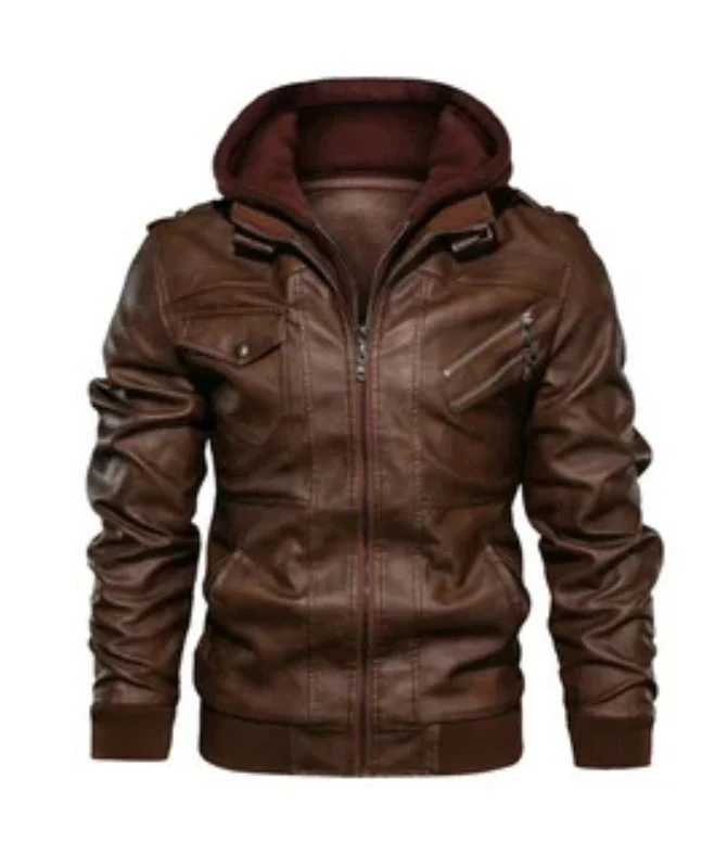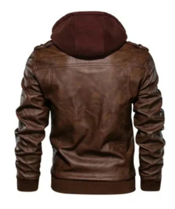 combining classic leather aesthetics with modern comfort. The detachable hoodie adds a