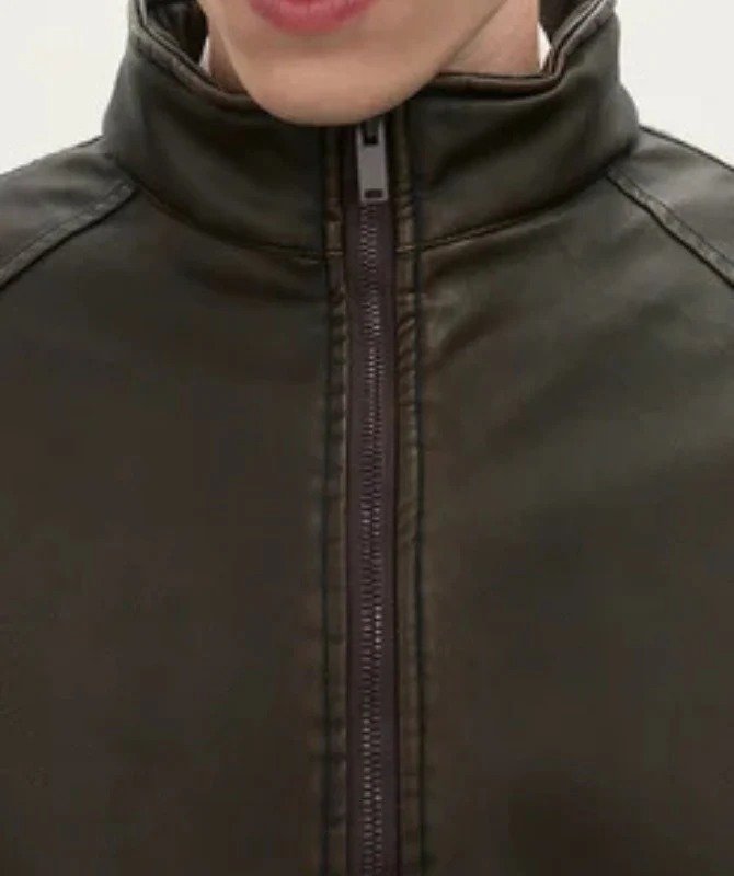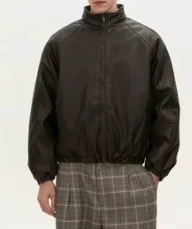 crafted from 100% genuine sheep leather. Its smooth finish, high-neck design, and relaxed fit