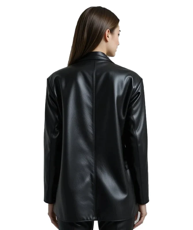 The oversized shape is made with comfort and confidence in mind allowing for a structured shoulder and notch lapel with an elegance of a single button closure. The leather on it is smooth black and it has an assertive yet elegant edge to it; the kind that would pair well with either a casual or a dressing composition.