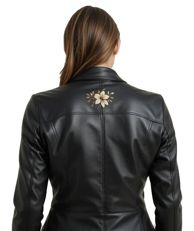 Women’s Black Sheep Leather Jacket with custom back embroidery