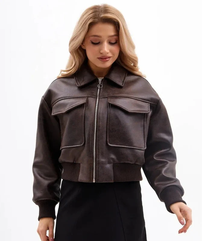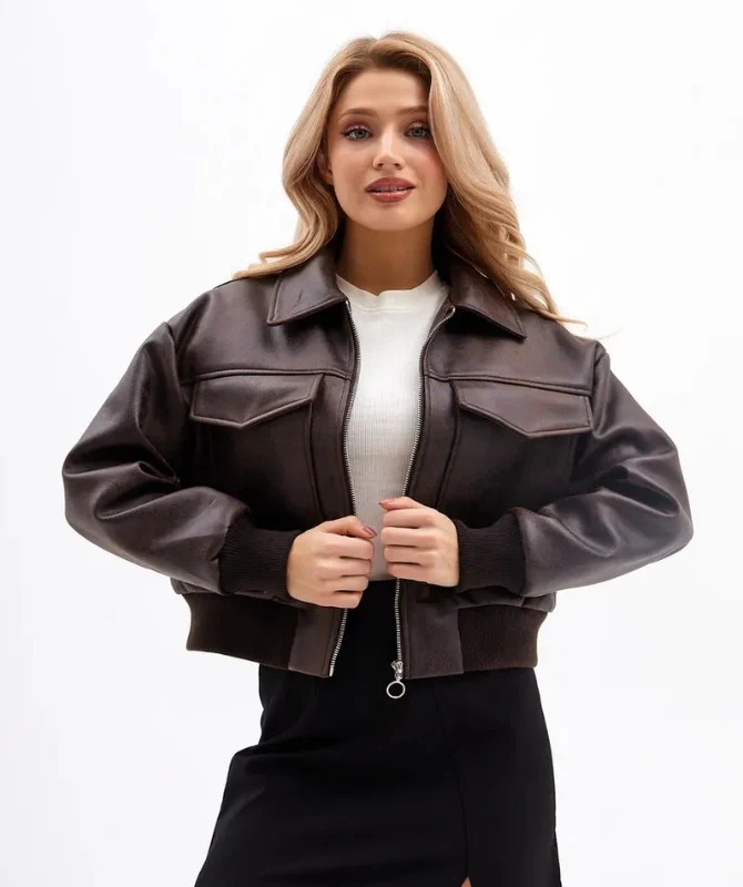 Women’s Brown Cropped Leather Jacket – 100% Genuine Sheep Leather | Trendy Streetwear Style