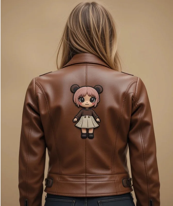 Women’s Brown Leather Jacket with Less Front and Labubu Embroidery on Stage