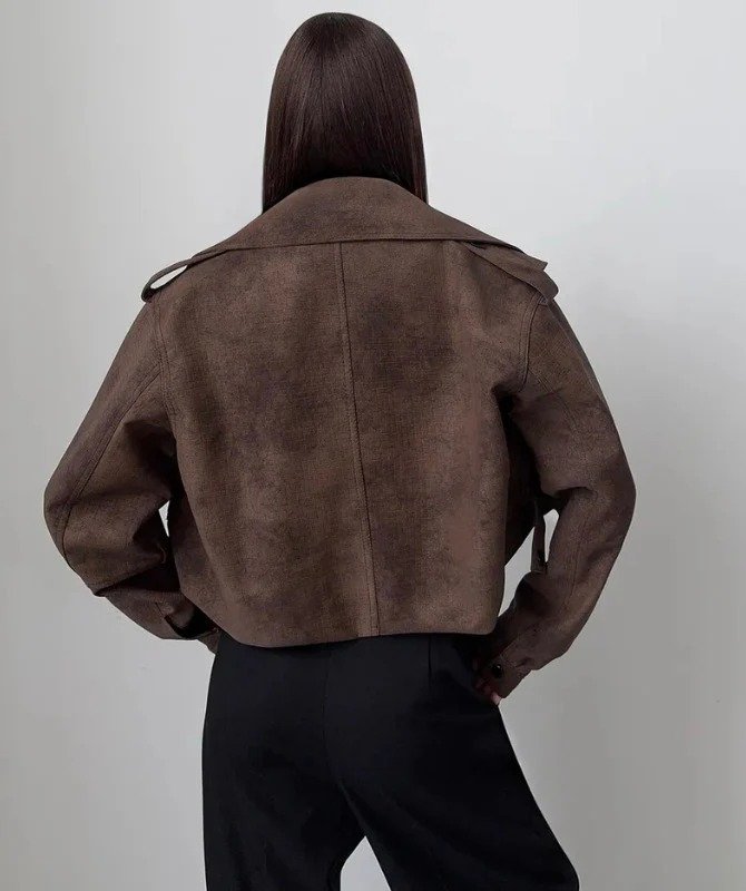Designed with a wide, dramatic lapel, asymmetric front flap panel, and oversized fit, this jacket brings a contemporary twist to classic moto aesthetics. Its rich brown tone adds warmth and versatility, making it perfect for layering over turtlenecks, tees, and chic evening outfits.