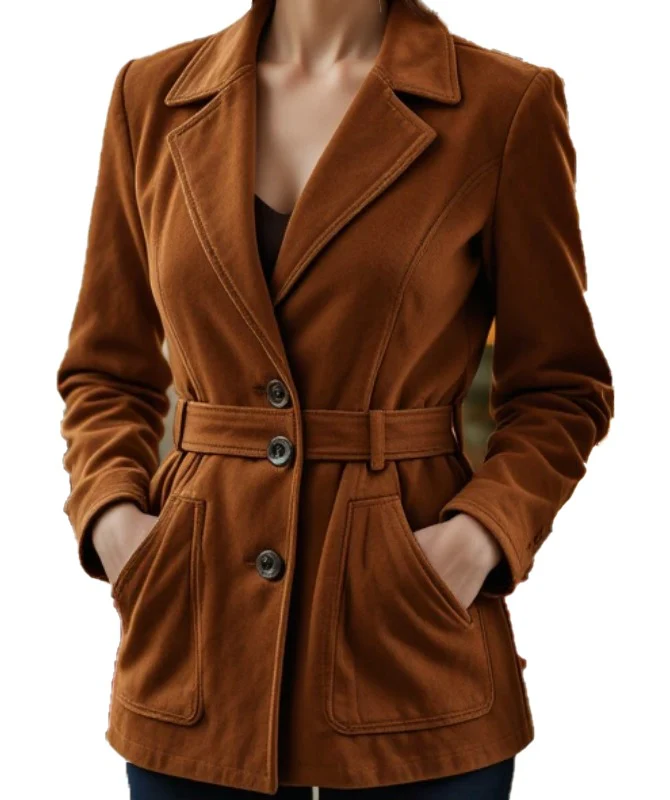 The JW Leather Women’s Brown Suede Belted jacket brings all-time elegance and day-to-day convenience. This winter jacket is designed out of luxuriously soft and tough premium suede to add some elegance on cold winter days. The traditional brown color makes every ensemble look warmer, whereas the belted waist makes every figure sleek and feminine.