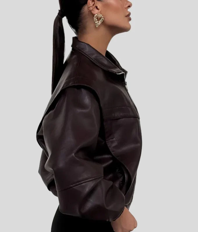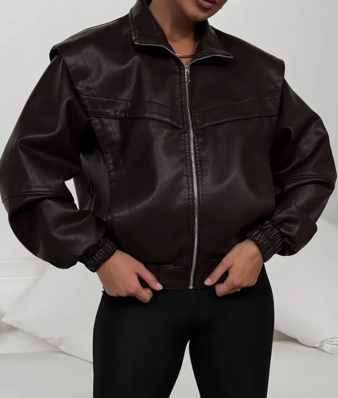 Women’s Dark Chocolate Sheep Leather Bomber Jacket – Luxury Oversized Zip-Up Style