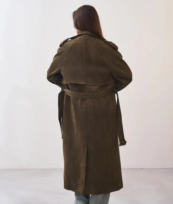 Women’s Dark Olive Green Trench Coat – Belted Waist, Double-Breasted & Epaulet Detail