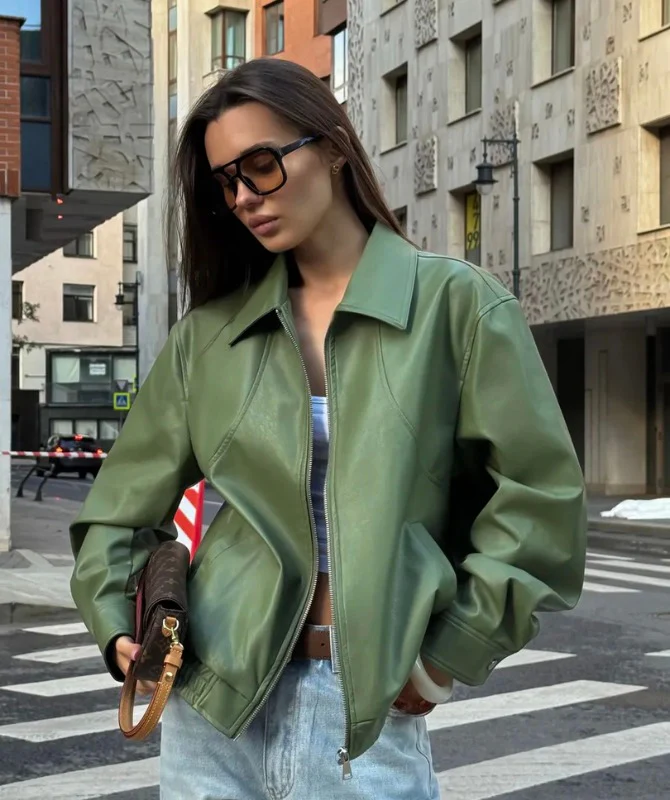 Women’s Green Sheep Leather Bomber Jacket – Luxury Soft Leather Streetwear