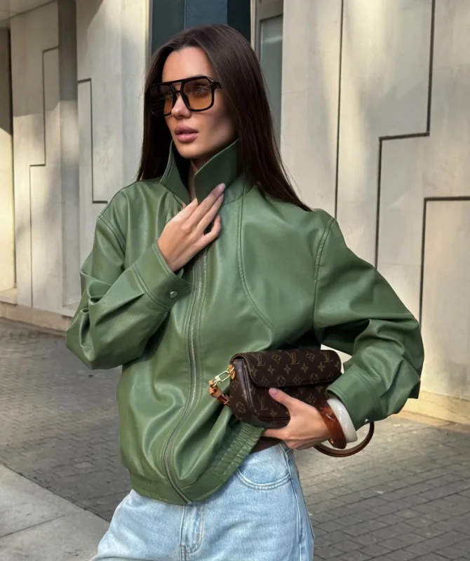 Designed with a modern high collar, zip-up front, and relaxed bomber fit, it adds an instant edge to any outfit — whether you’re dressing up your jeans or layering over a dress. The subtle green tone gives it a fresh, luxurious vibe that stands out without trying too hard.