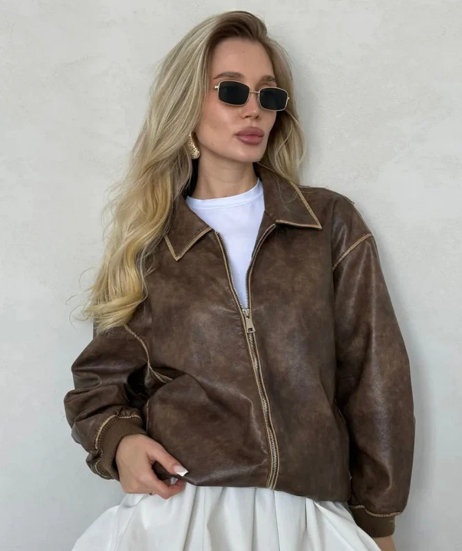 Women’s Oversized Brown Leather Jacket – 100% Genuine Sheep Leather Streetwear Style