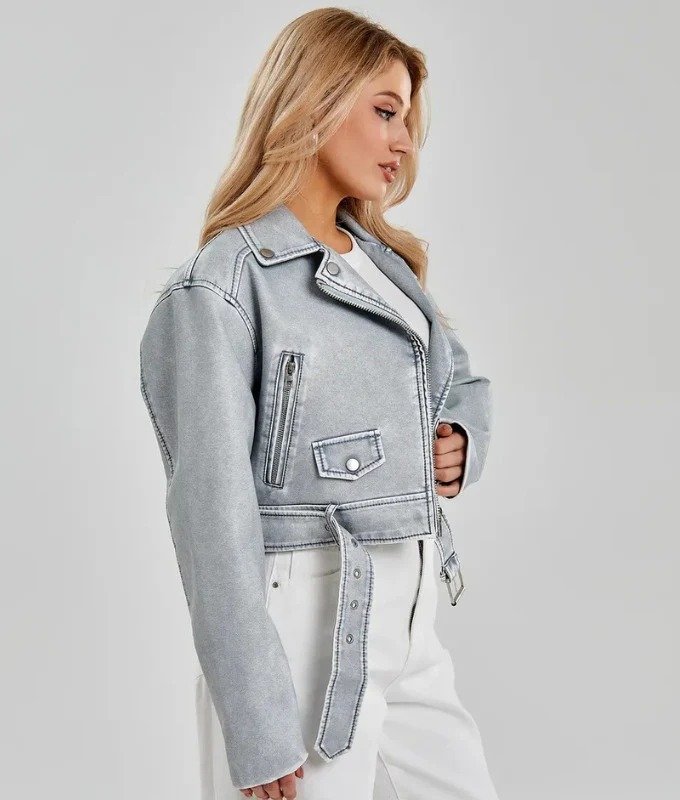 The cropped biker silhouette, asymmetric zipper, and belted waist make it a standout piece that perfectly blends classic moto vibes with modern street-chic energy. Whether you’re dressing up for a night out or adding flair to a casual outfit, this jacket is your go-to statement piece.